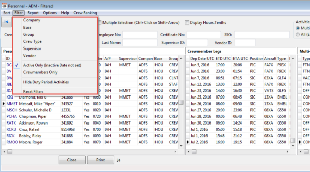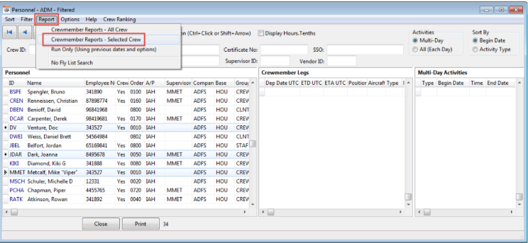 Select the Report option on top menu bar, and then Crewmember Reports – Selected Crew.