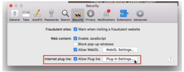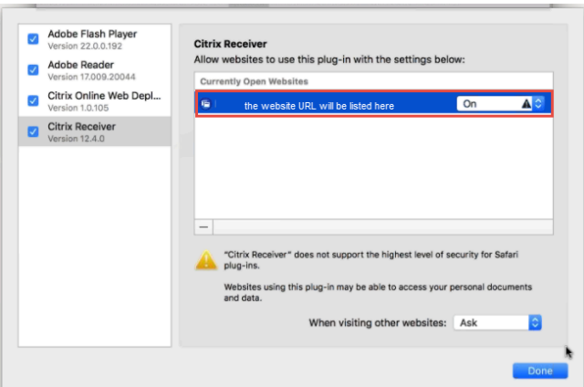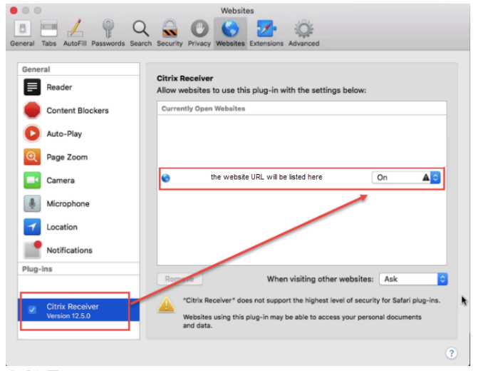 If the current version of the Citrix Workspace App is installed and the FOS Login window still will not launch the Safari plug-in settings may need to be updated.